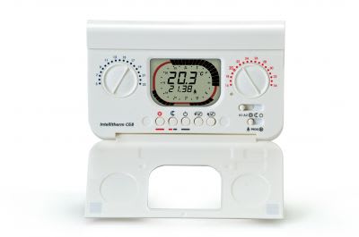 Cronotermostato elettronico a microprocessore, con programmazione giornaliera per il comando di impianti di riscaldamento e di condizionamento. Portata contatti 5(3)A 250V~.Microdisconnessione (1BU).Contatto in commutazione libero da tensione.Alimentazione con 2 pile a stilo tipo AA da 1,5V alcaline lunga durata senza connessioni alla linea elettrica.Intellitherm C68 viene fornito con uno zoccolo adatto per il montaggio su scatole da incasso a 3 moduli, tonde o per montaggio a parete, la sporgenza dell'apparecchio è minima e l'ambientazione ancora più facilitata.Collegamento all'utilizzatore con 2 fili.Montare il cronotermostato a 1,5 metri di altezza dal pavimento, lontano da cucine, finestre, porte e fonti di calore in generale.Due pulsanti colorati, uno rosso e l'altro blu per la regolazione delle temperature di COMFORT e di ECONOMY.Un cursore per la scelta del modo di funzionamento: A1, A2, COMFORT, ECONOMY, ANTIGELO.Un cursore per la scelta del tipo di funzionamento: ESTATE-INVERNO, con lo stesso cursore si può accedere alla programmazione.Due tasti per la regolazione dell'ora in corso.Tre tasti per la scelta del periodo di COMFORT, di ECONOMY e ANTIGELO.Un tasto di RESET per ripristinare il programma preimpostato.Un dip switch per selezionare il modo ANTIGELO 5°C oppure SPENTO (ON a 0°C).Possibilità di visualizzazione dei dati statistici dell'impianto: ore di funzionamento del giorno precedente e dall'inizio del funzionamento dell'apparecchio, temperatura minima e massima del giorno precedente e l'ora in cui viene misurata.