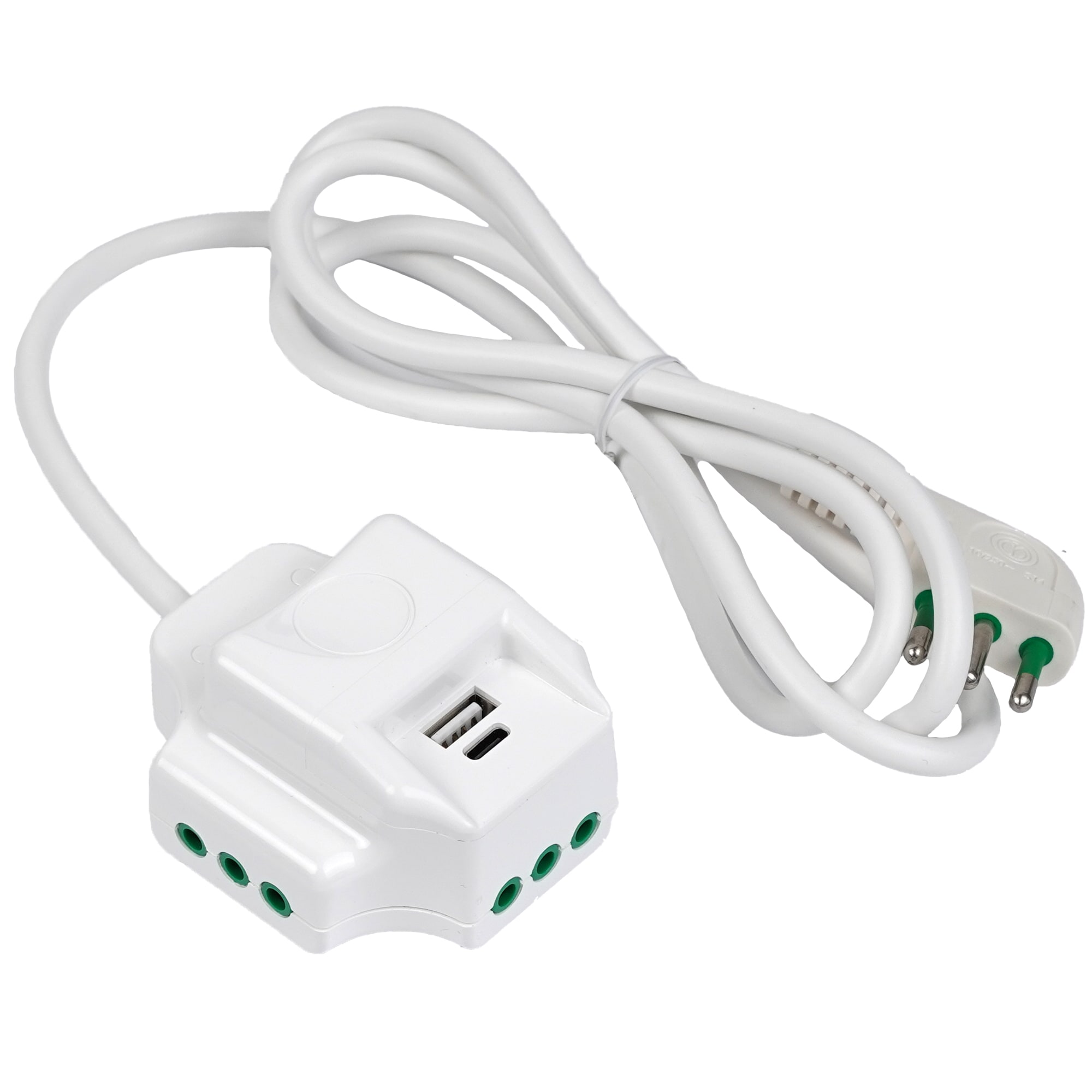 Multipresa3 prese italiane 2P+T 10A2 prese USB-A 5V 3Acavo 1,5 m. 3G0,75 H05VV-Fspina a squadra italiana 2P+T 10A, colore bianco