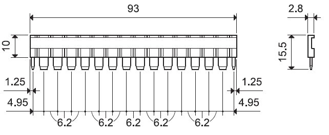 Pettine a 16 poli, Valori nominali : 36 A - 250 V. Possibilità di connessioni multiple, affiancando i pettini.