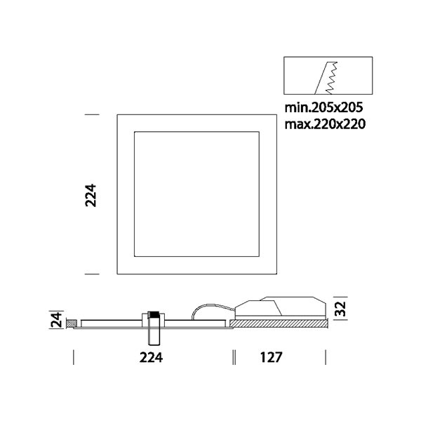 SlimLex, nuova ed esclusiva gamma di faretti da incasso e da plafone di forma tonda e quadrata con Led di ultimissima generazione. Questa serie è nata per soddisfare le richieste sempre più esigenti imposte dai moderni progetti illuminotecnici destinati all’arredo di interni. L'illuminazione deve essere efficace e flessibile, in modo da definire al meglio gli ambienti secondo le esigenze più variegate; deve essere di notevole impatto, con bassi costi di gestione e saper durare nel tempo. Deve dar vita a effetti di luce speciali, quali la luce d'accento e la luce d'ambiente. Corpo: in alluminio pressofuso. Diffusore: pannello in PMMA spessore 6mm con serigrafia a laser dimensionata alla potenza del LED.Verniciatura: A polvere con vernice epossidica in poliestere resistente ai raggi UV. Equipaggiamento: Completo di staffa regolabile in acciaio. Normativa: Prodotti in conformità alle norme EN 60598-1-CEI 34.21, hanno grado di protezione secondo le norme EN 60529. LED: ad alta efficienza 1350lm - 16W - 3000K - CRI 80. Fattore di potenza: ≥0,9. Classificazione rischio fotobiologico: gruppo esente. Mantenimento del flusso luminoso al 70%: 25.000h (L70B50). diam. incasso 205/220mm.