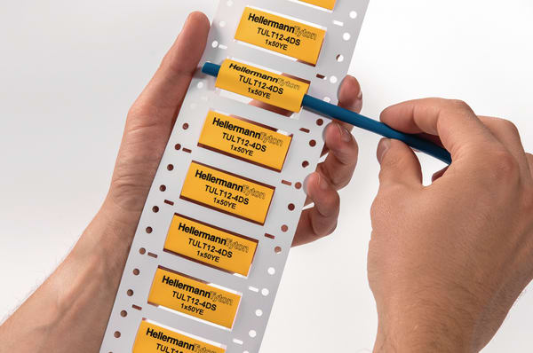 Rapporto di restringimento 3:1. Pretranciati a 50mm, 25mm e 16mm come standard. Disponibili in colore bianco e giallo. Buona resistenza meccanica e ai solventi organici e chimici. Elevata flessibilità. Forniti in comodi contenitori. Il TULT DS è un materiale termorestringente 3:1 certificato UL, pretranciato e disposto in un comodo formato Ladder Style. Questo formato permette non solo la stampa su entrambi i lati, ma anche la possibilità di prelevare il marcacavo desiderato con facilità. Il composto di poliolefina del TULT ha buone caratteristiche meccaniche e di resistenza ai solventi organici e chimici. La superficie della guaina viene preparata in modo da garantire una elevata qualità di stampa in ogni momento utilizzando le stampanti a trasferimentotermico di HellermannTyton.