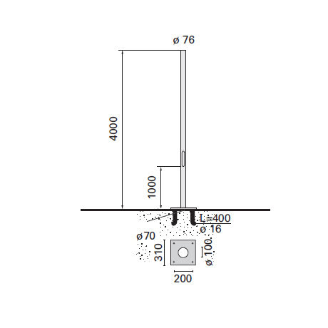 Palo cilindrico realizzato in acciaio zincato a caldo 70 micron, come da normativa UNI EN ISO 1461 (EN 40-5), con successivotrattamento superficiale di verniciatura acrilica a polvere texturizzata grigio. Il palo è costituito da un unico tubo saldato, diametroø76mm, spessore 3 mm e altezza 4000 mm . L'asola per la portella è dimensiona a 132x38 mm, ad altezza 1000 mm dal terreno,idonea per il montaggio della morsettiera ad un fusibile (cod. 1864) . Portella realizzata a toppa, in lega di alluminio GDALSI 12 Lapiastra di ancoraggio per il supporto del palo è in acciaio EN 10025S235JR (ex Fe 360 UNI 7070) zincato a caldo 70 micron, comeda normativa UNI EN ISO 1461 (EN 40-5); ha geometria quadrata, dimensioni 280x280 mm e spessore 15 mm. Le 4 asole didimensione 47x22 mm, con interasse di 200x200 mm, permettono il passaggio dei tirafondi di fissaggio. Il palo è assicurato allapiastra tramite saldatura alla base.; I tirafondi in acciaio, lunghi 400 mm e con diametro 18 mm, sono bloccati tramiteviterie inacciaio. Dimensioni (mm): ø76x4000. Colore: Grigio.