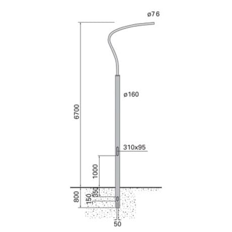 Palo di geometria cilindrica, realizzato in acciaio zincato a caldo 70 micron come da normativa UNI EN ISO 1461 (EN 40-5), sottoposto a trattamento di verniciatura a polvere texturizzata RAL 9005.Il palo è costituito da un unico tubo metallico; è in acciaio EN10025-S235JR, ha diametro 160 mm, spessore 3 mm e altezza 6700 mm f.t. L'asola per la portella è dimensiona a 310x95 mm, ad altezza 1000 mm dal terreno, idonea per il montaggio della morsettiera a due fusibili (cod. 1863). Il palo permette l'istallazione di morsettiere italiane (grado di protezione IP44 IK08), francesi, spagnole (solo piccole), inglesi (con adattatore in legno marino cod. B944 da ordinare separatamente) e tedesche/svizzere (tramite guida DIN cod. B943 da ordinare separatamente).Portella a filo, realizzata in fusione di alluminio, con relativa chiave per la portella (cod. 0246); la chiusura è assicurata tramite una guarnizione di tenuta che si adatta alle irregolarità superficiali del palo. Il palo è completo di braccio singolo di lunghezza 1400 mm. Braccio realizzato in acciaio S235JR ø76mm spessore 4mm. Nella parte superiore del palo è saldata una piastra metallica realizzata in acciaio zincato, munita di 4 fori filettati, adibita al fissaggio dei bracci per mezzo di viti M10 UNI 5931 in acciaio inox AISI 304.