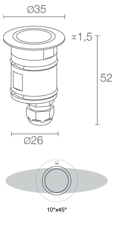 Incasso uplight da esterno (non adatto per immersione); a incasso (soffitto, parete, pavimento); corpo e ghiera in acciaio inox AISI 316L, schermo in vetro trasparente temprato, schermo in vetro acidato temprato. 2W. 500 mA. 4000 K. 54°