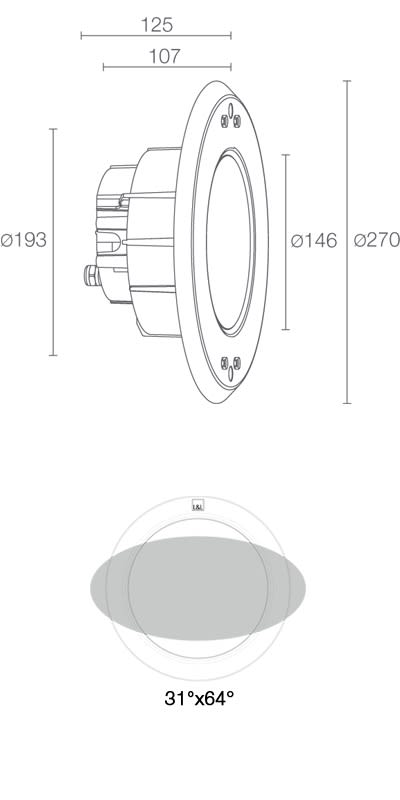 Incasso da immersione (non adatto per immersione in acqua salata, non adatto per applicazioni fuori dall’acqua); a incasso (parete), profondità max 10 m; corpo in tecnopolimero termocunduttivo, ghiera in acciaio inox AISI 316L; schermo in vetro extrachiaro temprato; finiture: acciaio inox microsabbiato. 30W. RGBW. 62°. 1876 lm