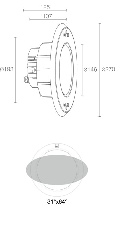 Incasso da immersione (non adatto per immersione in acqua salata, non adatto per applicazioni fuori dall’acqua); a incasso (parete), profondità max 10 m; corpo in tecnopolimero termocunduttivo, ghiera in acciaio inox AISI 316L; schermo in vetro extrachiaro temprato; finiture: acciaio inox microsabbiato. 30W. 4000K. 62°. 1876 lm
