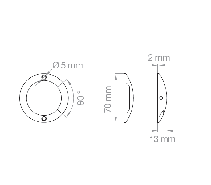 Mini-segnapasso LED superficie ultrapiatto con spessore 13mm in lega alluminio. 4 raggi. Tensione costante: utilizzare converter 12V. LED 0,8W 40lm 4000K CRI >80 12V DC.