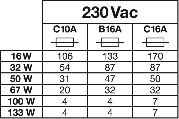 Max. Anzahl der Leuchten pro Leitungsschutzschalter C16: