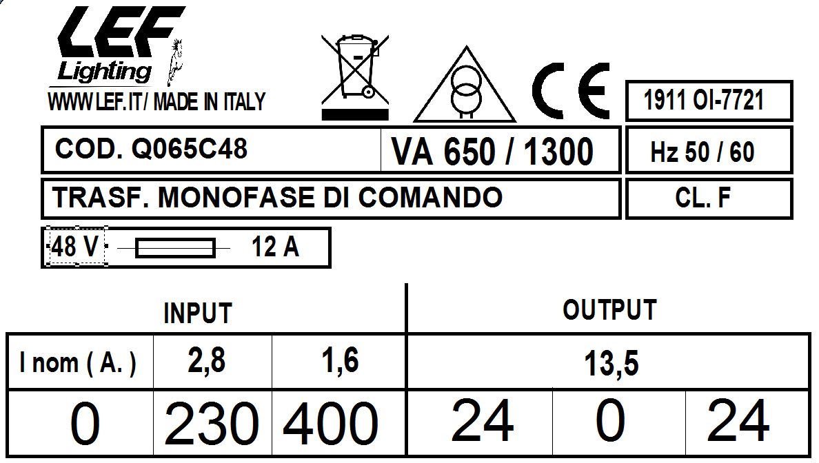 LEF LIGHTING SRL - LEFQ065C48 T.M. 650VA 230.400V / 24.0.24V - Q065C48