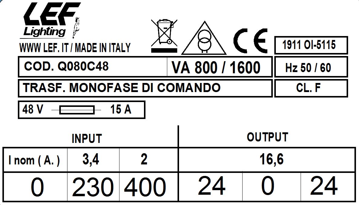 LEF LIGHTING SRL - LEFQ080C48 T.M. 800VA 230.400V / 24.0.24V - Q080C48