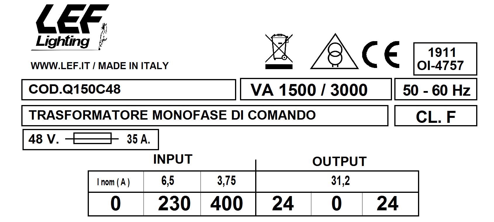 LEF LIGHTING SRL - LEFQ150C48 T.M. 1500VA 230.400V / 24.0.24V - Q150C48