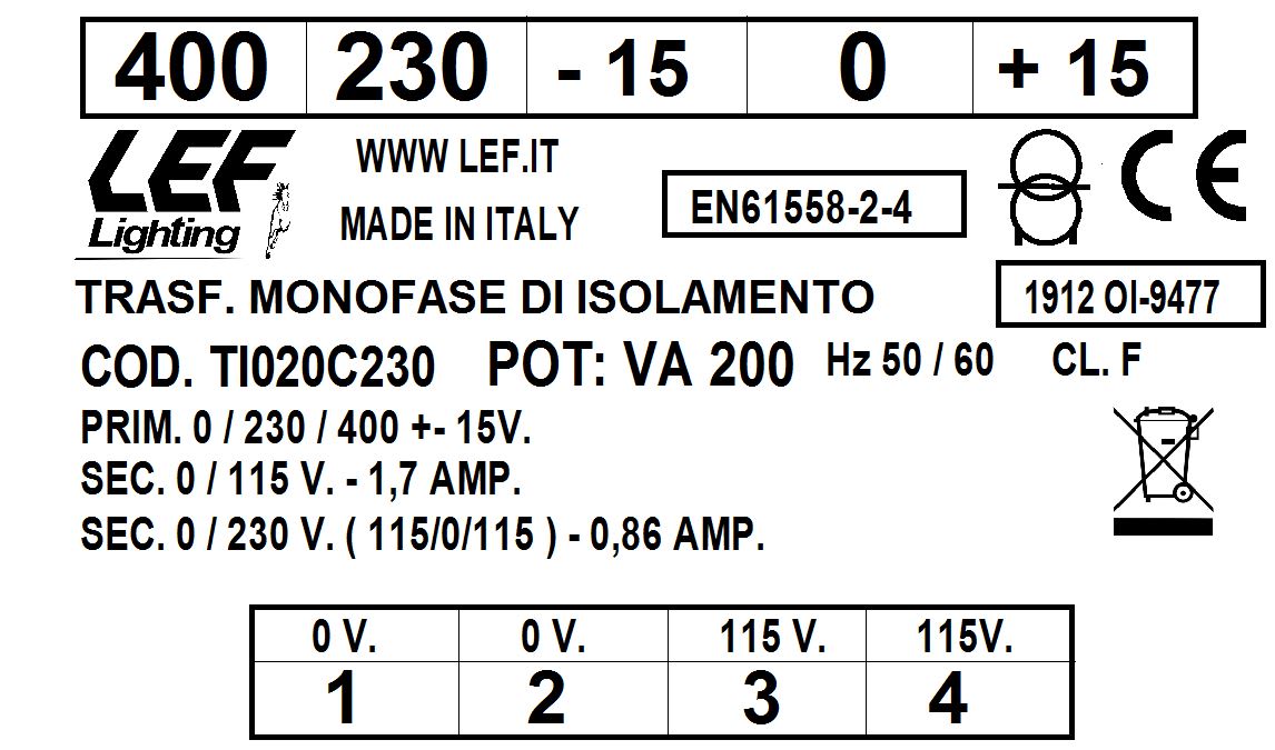 LEF LIGHTING SRL - LEFTI020C230 T.M. 200VA 230.400V / 115 230V - TI020C230