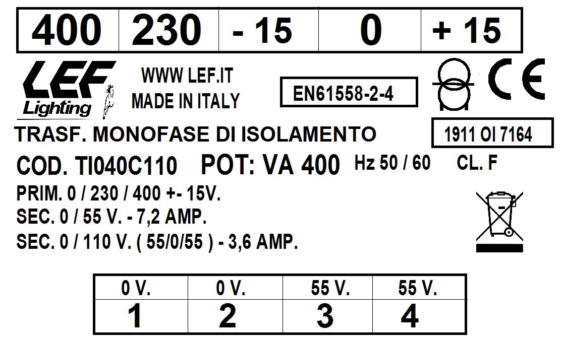 LEF LIGHTING SRL - LEFTI040C110 T.M. 400VA 230.400V / 55 110V - TI040C110