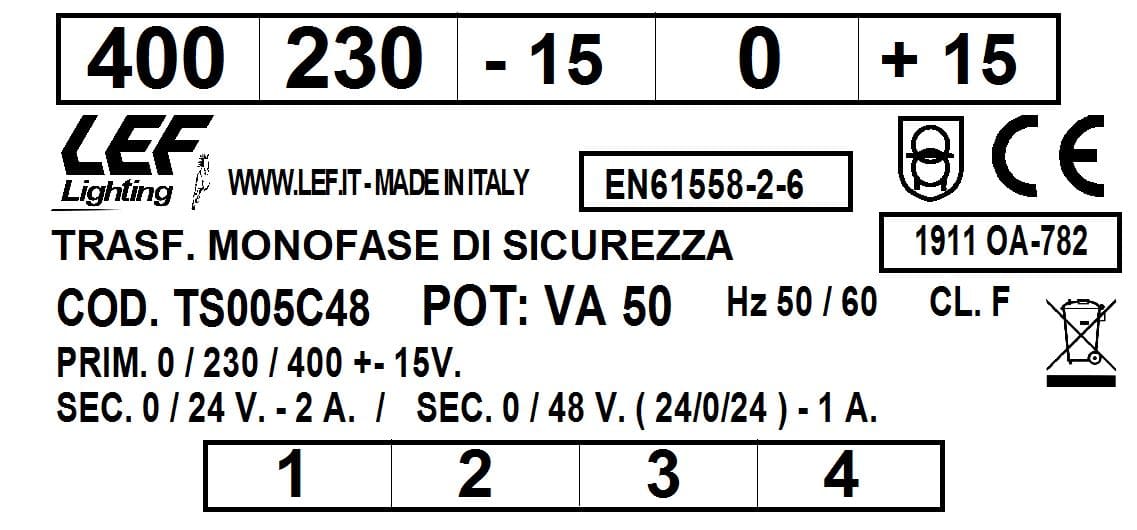 LEF LIGHTING SRL - LEFTS005C48 T.M. 50VA 230.400V / 24 48V - TS005C48