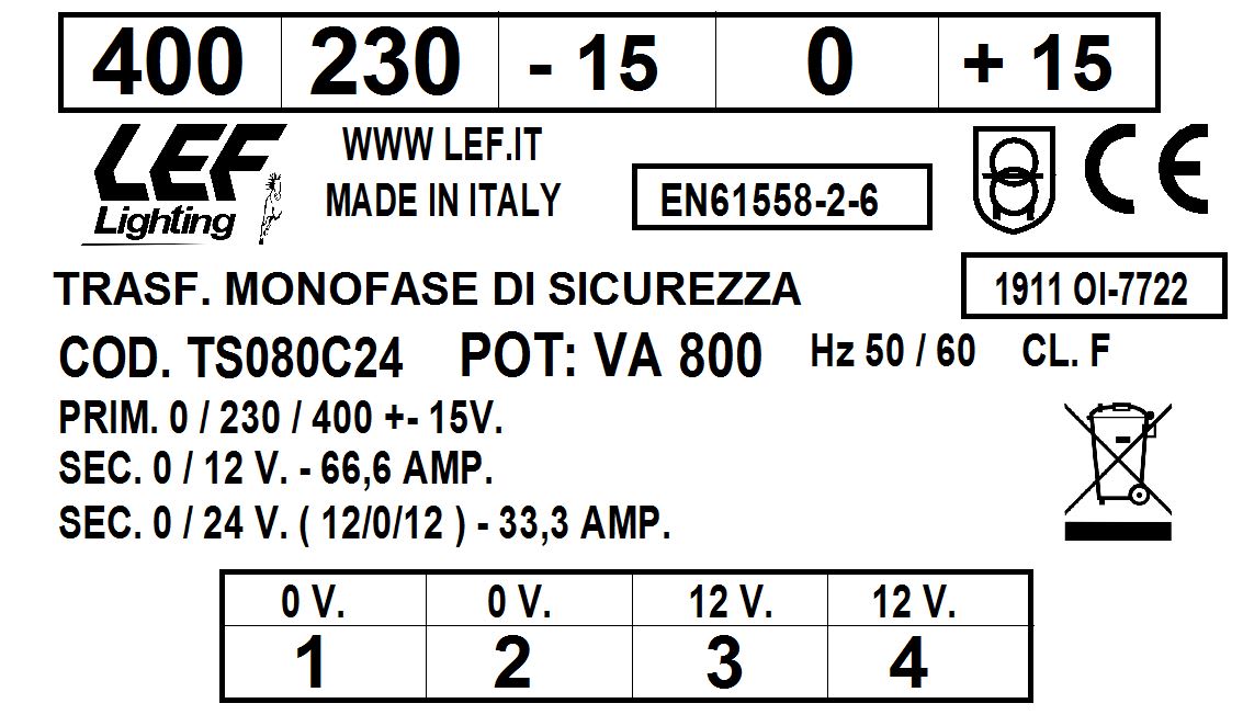LEF LIGHTING SRL - LEFTS080C24 T.M. 800VA 230.400V / 12 24V - TS080C24