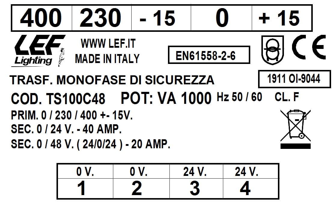LEF LIGHTING SRL - LEFTS100C48 T.M. 1000VA 230.400V / 24 48V - TS100C48