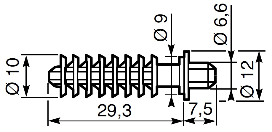 Tassello a vite con testa filettata diametro 6,6 mm. Diametro del foro 8 mm.