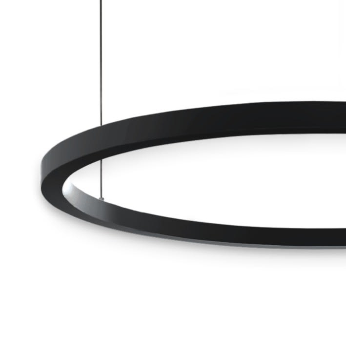 Sospensione a singola emissione per applicazione indoor. La sorgente luminosa LED, di colore bianco caldo, con distribuzione luminosa General Lighting, è composta da 588 LED topled, con una CCT 3000 K ed un CRI 80; il flusso luminoso della sorgente è di 15588 lm, con un'efficienza nominale di 136.7 lm/W.