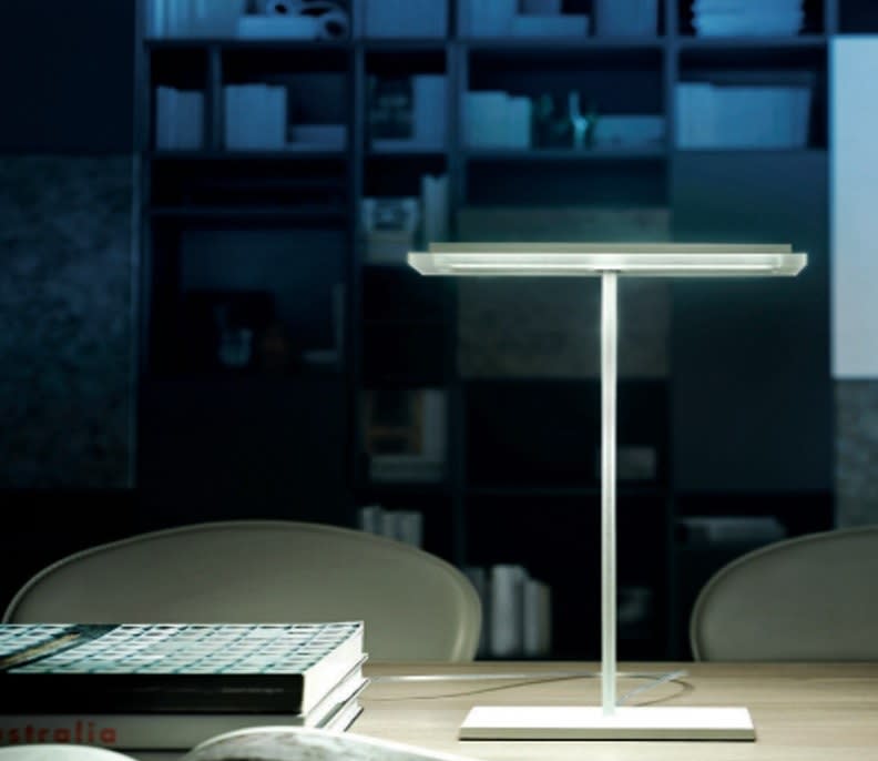 Apparecchio per interni. Lampada da tavolo con montatura in metallo verniciato. Diffusore: polimetilmetacrilato sabbiato. Corpo: metallo vernicaito bianco RAL9003 goffrato. Lampada: LED 7.4W 836Lm 3000K.