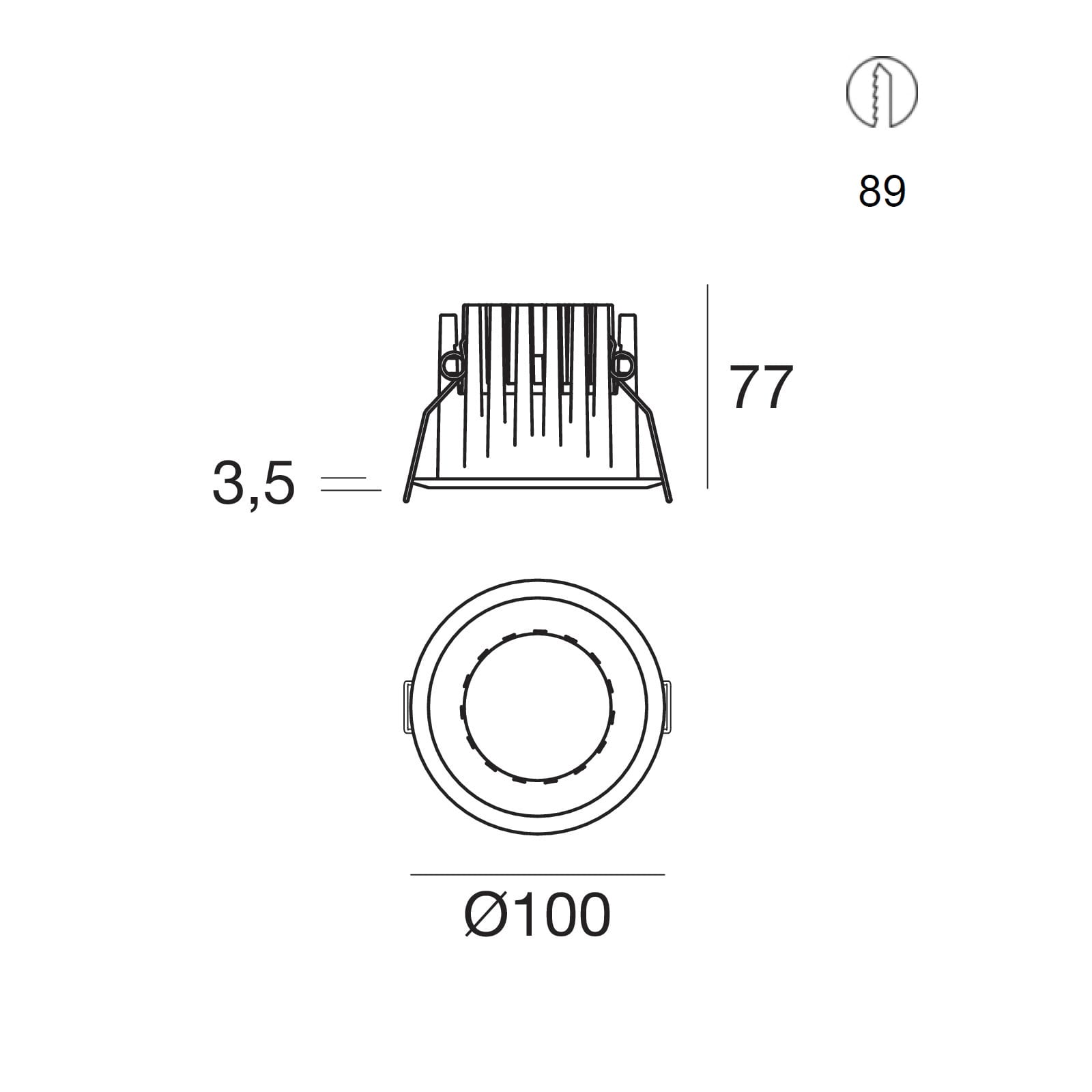 L'apparecchio presenta una classe di isolamento III ed è installabile a soffitto, con foro tondo di diametro 89 mm (nel cartongesso).