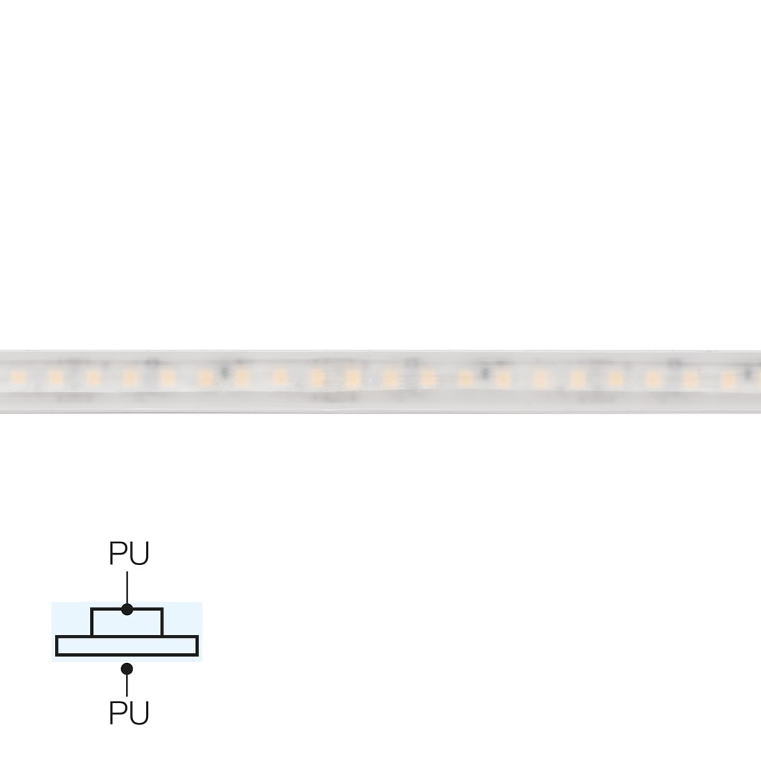 Led strip a singola emissione per applicazione outdoor. La sorgente luminosa LED, di colore super caldo, con distribuzione luminosa General Lighting, è composta da 700 LED topled, con una CCT 2700 K ed un CRI 85; il flusso luminoso della sorgente è di9000 lm, con un'efficienza nominale di 72.0 lm/W.