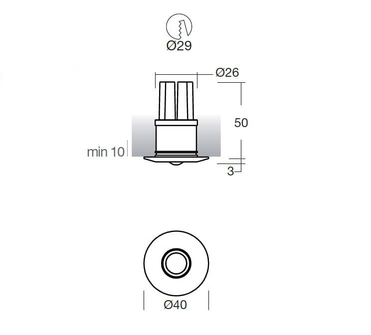 L'apparecchio presenta una classe di isolamento III ed è installabile a parete o soffitto, con foro tondo di diametro 29 mm (nel cartongesso).