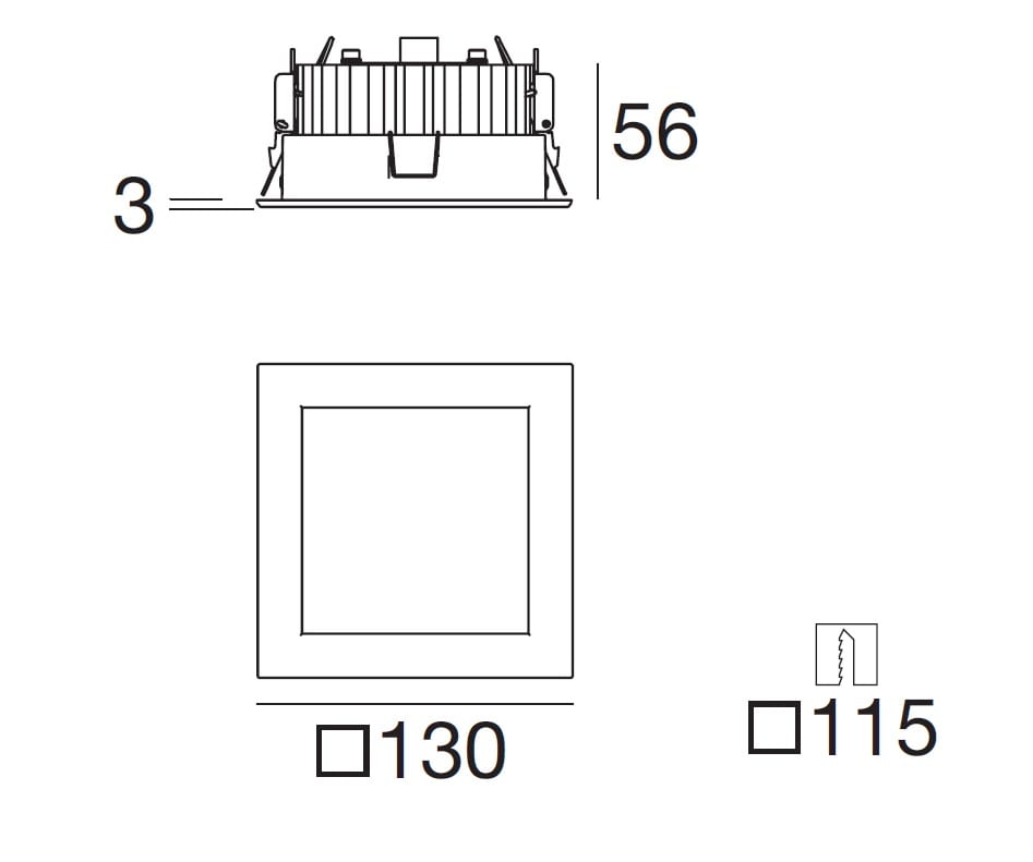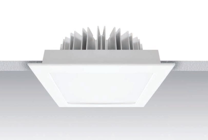 Downlights a singola emissione per applicazione indoor. La sorgente luminosa LED, di colore bianco caldo, con distribuzione luminosa General Lighting, è composta da 48 LED topled, con una CCT 3000 K ed un CRI 80; il flusso luminoso della sorgente è di1488 lm, con un'efficienza nominale di 114.5 lm/W.