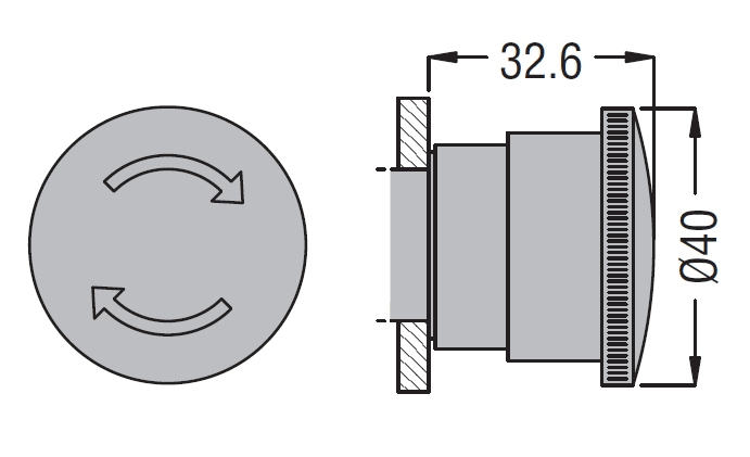 Operatore per pulsanti a fungo, ad aggancio con sgancio a rotazione, senza base di fissaggio. Durata meccanica: 300.000 cicli