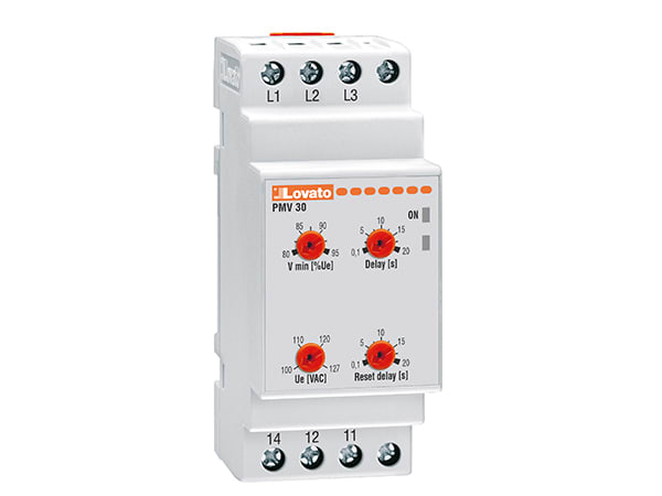 Relè voltmetrici per sistemi trifase senza neutro. Sistema trifase senza neutro. Minima tensione AC. Intervento ritardato. Mancanza fase ed errata sequenza fasi. Intervento istantaneo. relè voltmetrico autoalimentato di minima tensione, mancanza fase ed errata sequenza fasi , 4 tensioni nominali selezionabili: PMV30 A240: 208-220-230-240VAC , 8 tensioni nominali selezionabili: PMV30 A575: 380-400-415-440-460-480-525-575VAC , elevata precisione d’intervento , misure in TRMS (True Root Mean Square / valoreefficace), controllo delle tensioni concatenate , rilevamento della mancanza fase se una delle tensioni è <70% di quella nominale , tempo di intervento per mancanza fase: 60ms , 1 uscita a relè , 1 contatto in scambio in uscita , contenitore modulare DIN43880 (2 moduli) , grado di protezione IP40 sul fronte (se montato in contenitore e/o quadro elettrico avente IP40), IP20 morsetti.