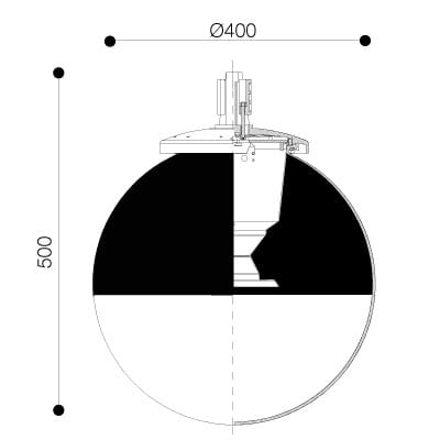 Sfera 400 Led IP65 Rovesciata - Arredo Urbano LED(IP65) a diffusore sferico semi verniciato per utilizzo palo o su braccio Ø60mm in testa, per montaggio rovesciato. Diffusore Sferico semi verniciato in PMMA di diametro Ø400mm. Base in tecnopolimero rinforzato. Sistema di bloccaggio ad espansione all’interno di bracci Ø60. Gruppo cablaggio composto da Cono di copertura per ricovero driver e vano a sezione circolare in policarbonato ad alta resistenza per passaggio cavi. Supporto circuito Led in alluminio. Sorgente luminosa Led a posizione fissa ad emissione rotosimmetrica. Circuito Led circolare su cappello alluminio, 50Led. Alimentazione elettronica integrato 220-240V 50-60Hz. Apparecchio ad installazione diretta su palo Ø60mm in testa tramite sistema di bloccaggio ad espansione all’interno. Bloccacavo autoregolante per cavo max Ø10mm. Manutenzione ordinaria non necessaria. Manutenzione straordinaria sfilando il diffusore. 50LED 15W 2100lm 3000K CRI >80.