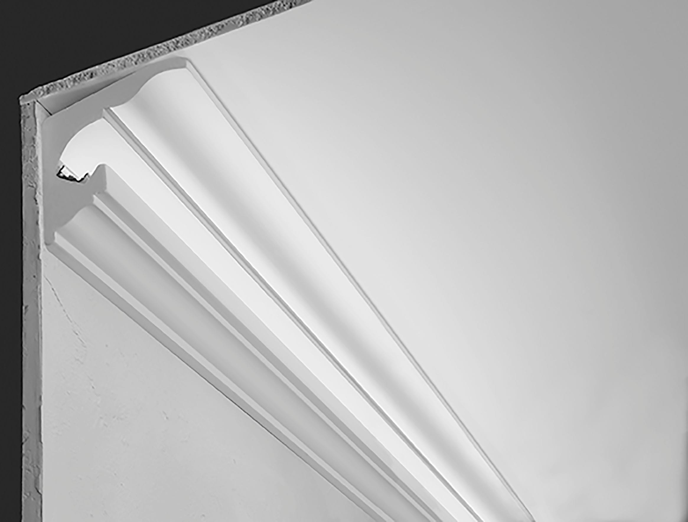 P16 - Profili lineari in gesso, realizzati in Italia con materiali naturali minerali e vegetali. Profilo prefinito in gesso per installazione a parete, effetto luce indiretta. Elemento completo di profili di alluminio per applicare una striscia LED. Chiusure laterali da effettuare durante il montaggio. 1pz PROF./BARRA/3E/1M profilo alluminio 1m. 1pz DIF.BAR/3E/1M con copertura trasparente. Striscia LED da ordinare separatamente.