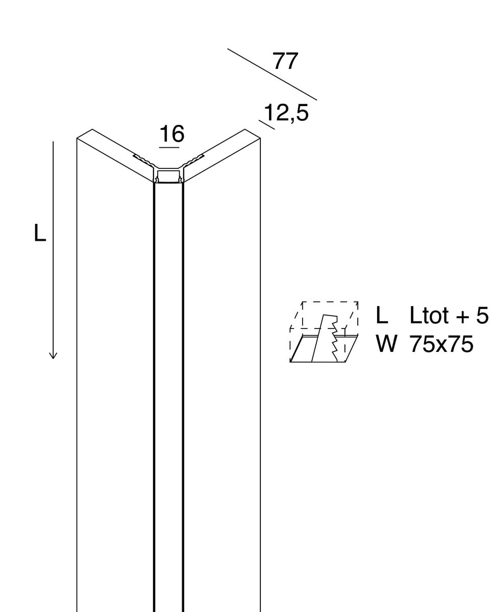 L-16 CORNER profilo lineare per spigolo esterno non installabile direttamente su muratura per Strip LED tagliabile in opera, per realizzare linee di luce incassate nel cartongesso. Corpo in cartongesso di spessore 12,5 mm da lastra standard. Profilo dissipante in lega di alluminio anodizzata naturale e schermo di protezione in PMMA opale inclusi. Strip LED e alimentatore elettronico 24Vdc remoto da ordinare a parte. Non esporre a intemperie o luce solare diretta e non inserire in materiale isolante. (versione HYDRO)