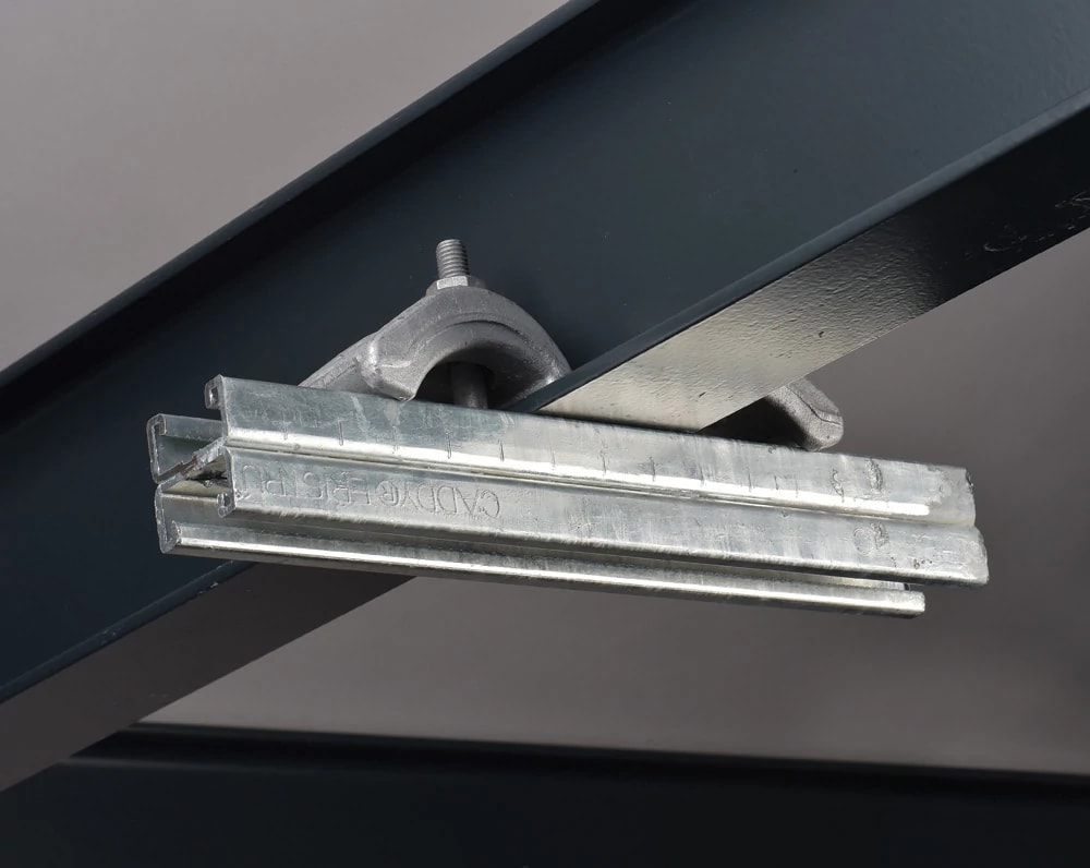 I profili saldati schiena contro schiena offrono un fissaggio continuo e facilmente regolabile su tutta la lunghezza del profilo. I morsetti a pressione si fissano sul profilo strut tra due labbra impedendogli di ruotare. Sistema di fissaggio sicuro per applicazioni pesanti per passerella portacavi, condotti o tubi.