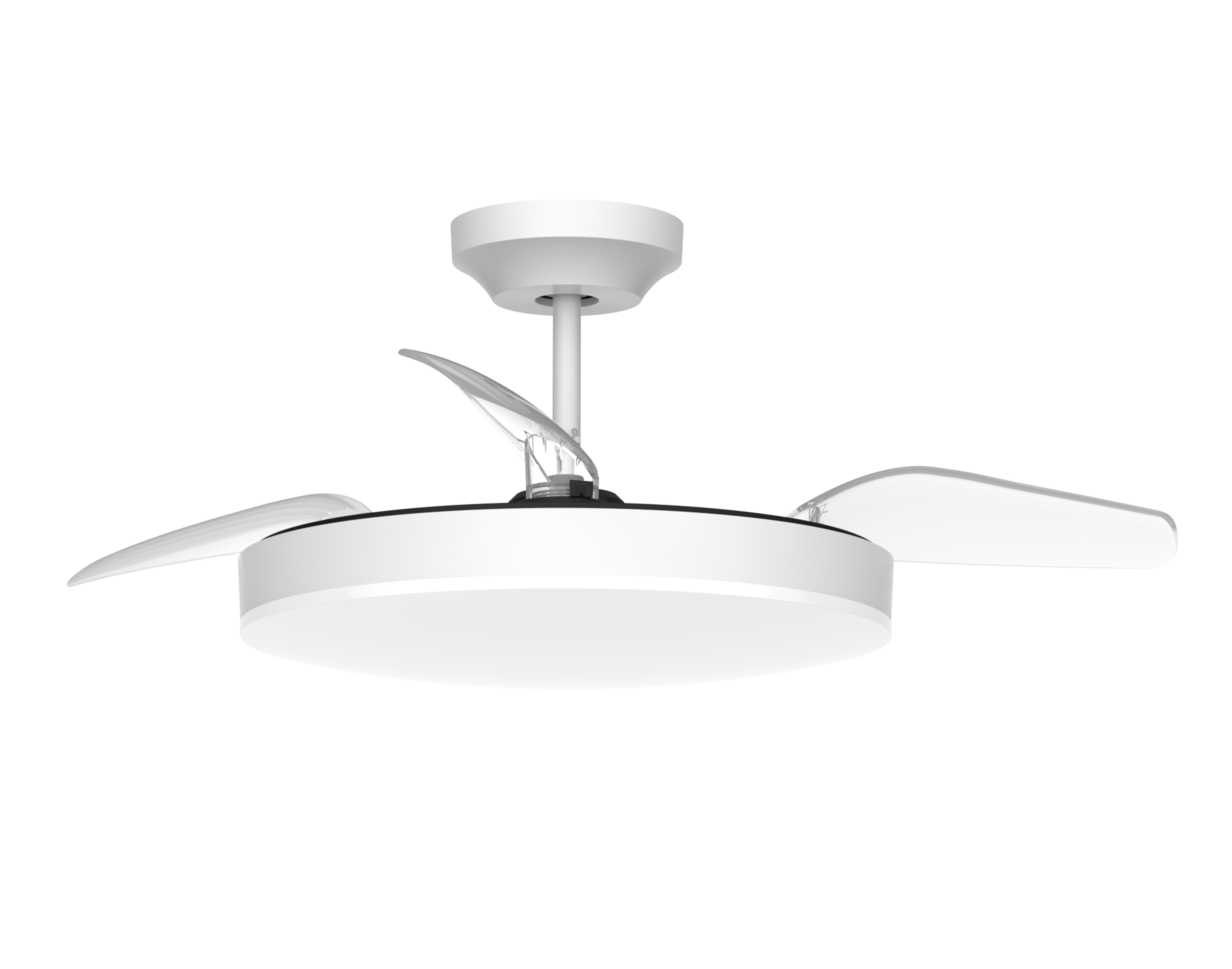 Elegante combinazione di apparecchio di illuminazione a soffitto con ventilatore. Motore di alta qualità e ultra-silenzioso. Pale del ventilatore retraibili automaticamente. Dimmerabile con multi-CCT tramite telecomando. Ventilatore con sei regolazioni di velocità. Flusso d'aria reversibile per un utilizzo tutto l'anno.