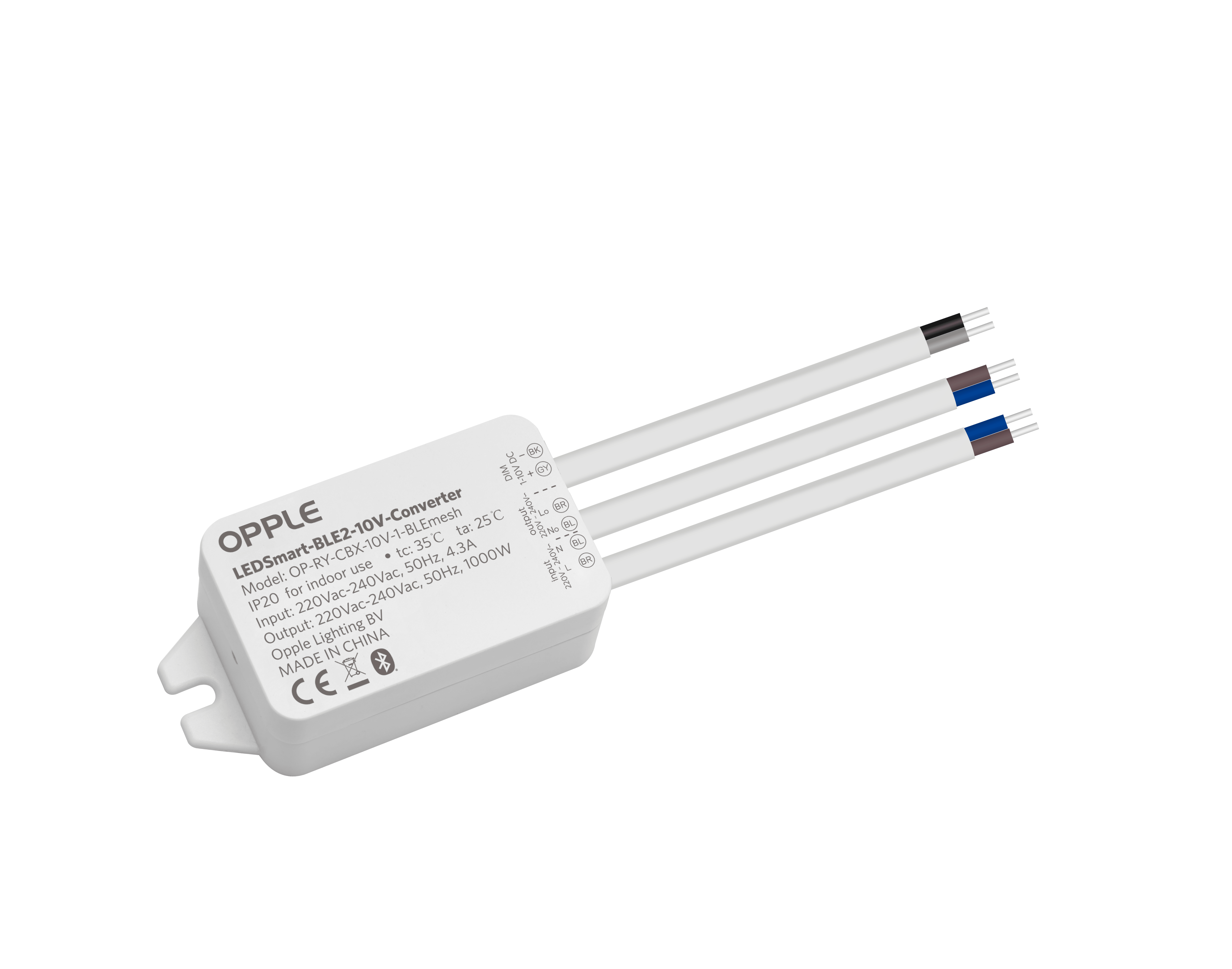 Convertitore compatto da BLE a 1-10V da utilizzare nei sistema di illuminazione intelligente OPPLE. Integra qualsiasi marca di apparecchio 1-10V nel sistema di illuminazione intelligente OPPLE. Controllo completo di uno o piu apparecchi 1-10V con Smart Switch o Smart App. Compatibile con i sensori intelligenti OPPLE BLE2 e gli interruttori intelligenti OPPLE BLE2. Semplice da configurare con la OPPLE Smart Lighting App, o Smart Connect Box con Smart Web Interface. Incluso contatore di energia, visualizzazione dei dati nell?app o nel portale. Comunicazione wireless completa tramite il protocollo Bluetooth? Low Energy (BLE) SIG Mesh standardizzato.