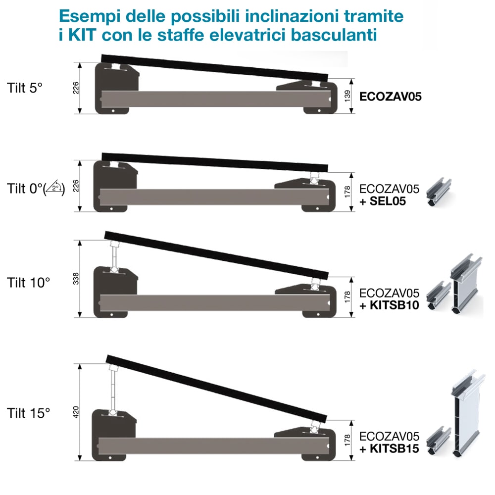 ECOZAV05 supporto zavorra 5° ecosostenibile costituito da una base in conglomerato cementizio avvolta tra due gusci in gomma riciclata (PFU) con annegate due guide in alluminio per il fissaggio del pannello tramite gli appositi morsetti. Il peso del supporto è di 41 kg e i pannelli possono essere disposti sia in orizzontale che in verticale, con inclinazione di 5° e con l’aggiunta delle staffe elevatrici SEL05 / SEL10 / SEL15, combinate tra loro, si possono ottenere tilt di 0°, 10° e 15°. Per aumentare la stabilità del sistema di sostegno, sono disponibili delle zavorre aggiuntive da sovrapporre nella parte centrale del supporto e tramite due fori passanti, presenti nella parte anteriore e posteriore, è possibile collegare una cintura perimetrale, costituita da profili e staffe, che vincolati tra loro garantiscono una maggiore resistenza al carico vento. ECOZAV05 è testato nella galleria del vento e sottoposto a prove di strappo in condizioni climatiche estreme da -20°C a +80°C. I supporti sono in appoggio sulla superficie e non richiedono di essere fissati tramite tasselli o altri sistemi di ancoraggio. I gusci in gomma riciclata posti alle estremità contrastano per attrito lo scivolamento della struttura e salvaguardano la copertura su cui vengono appoggiate senza dover interporre un tappetino di isolamento CARATTERISTICHE TECNICHE - Inclinazione supporto zavorra : 5° - Peso / Tolleranza peso : 41 kg / ±5% - Dimensioni / Tolleranza : 1060 x 226 x 200 mm / ±1% lunghezza BASE DI APPESANTIMENTO - Materiale : Elemento prefabbricato di calcestruzzo vibrocompresso realizzato con inerti ad alta resistenza a granulometria controllata e ottimizzata - Reazione al Fuoco : Classe A1 (secondo UNI EN 13501-1) - Norma di riferimento : UNI EN1340 - Massa volumica : 2200 kg/m3 GUSCI IN GOMMA - Materiale : Agglomerato in gomma interamente realizzato in materiale riciclato SBR da PFU (Pneumatici Fuori Uso) con un processo di produzione controllato mediante l’utilizzo di macchinari innovativi e secondo specifici ed elevati standard qualitativi GUIDE FISSAGGIO PANNELLI FV - Materiale : Lega di Alluminio EN AW-6060 T6