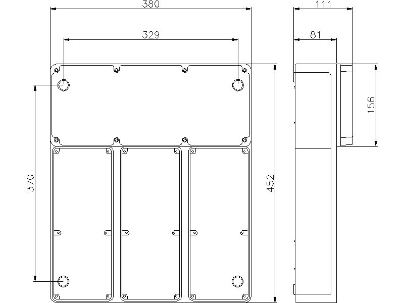 Quadri stagni flangiati ad alta capacità per installazione a parete di prese con interruttore di blocco e base portafusibili 16A - 32A - 63A e prese con interruttore di blocco senza base portafusibili da 63A. N° prese installabili: 3. Potenza dissipabile: 56W. Dimensionie: 380x452mm. Grado di protezione IP55