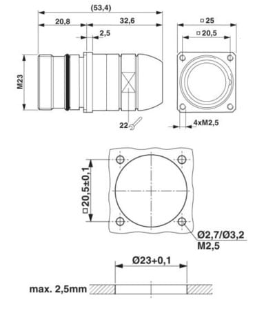 Durchführung Hinterwand, gerade, Schraubverriegelung, M23, Flachdichtung, 4xM2,5, geschirmt: ja, Wandstärke max.: 2,5 mm, Kabeldurchmesserbereich: 2 mm ... 10,5 mm