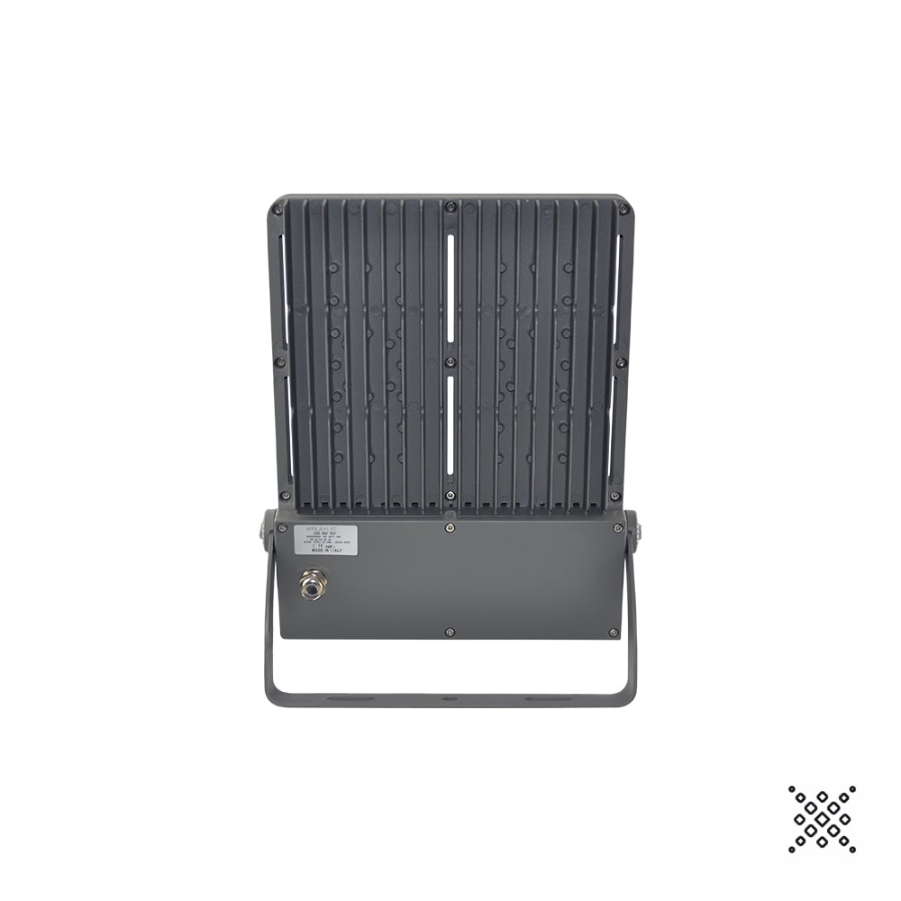 PROIETTORE DIMMERABILE DA ESTERNO AD ALTE PRESTAZIONI CON SISTEMA OTTICO MULTICHIP PER MIGLIORARE LA DISTRIBUZIONE DELLA LUCE E GARANTIRE UNA ELEVATA EFFICENZA E AFFIDABILITÀ, CORPO CON RESISTENZA AERODINAMICA MIGLIORATA, PASSIVATO E VERNICIATO CON VERNICI EPOSSIDICHE AD ALTA RESISTENZA, BULLONERIA IN ACCIAO INOX E SISTEMA GONIOMETRICO PER UNA PRECISA REGOLAZIONE DEL FASCIO DI LUCE
