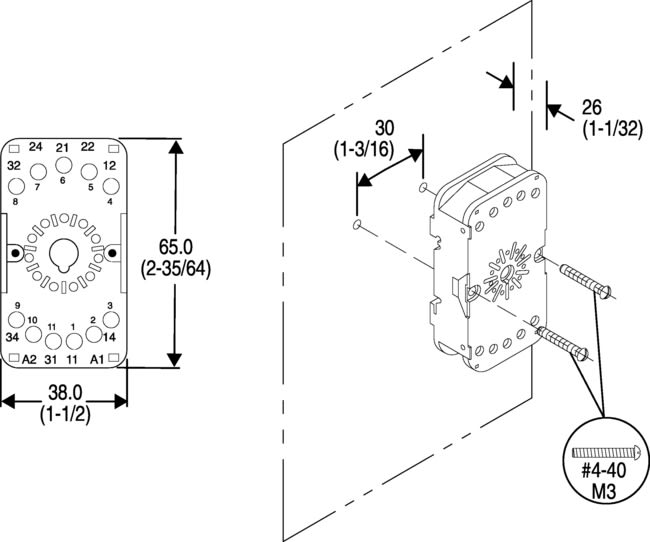 Zoccoli con base a tubo dotati di morsetti a vite – Montaggio a pannello o su guida DIN; Struttura con morsetti protetti. 11 pin per l’uso con relè 3PDT 700-HA.