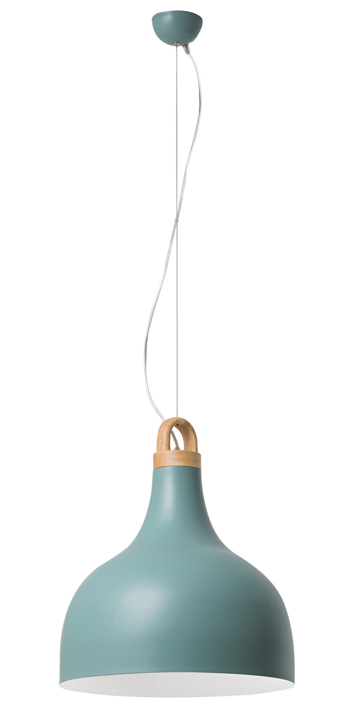 Lampada a sospensione con diffusore in metallo (disponibile in finitura nera opaca e verde salvia) e anello passacavo rivestito in legno, che dona untocco di personalit? e originalit? al prodotto. Disponibile in due misure e due colorazioni, con inernodel diffusore bianco, per un'ottima diffusione della luce, rosone in tinta col corpo lampada. Prodotto cablato con attacco E27, che consente di m ontare lampadina LED.
