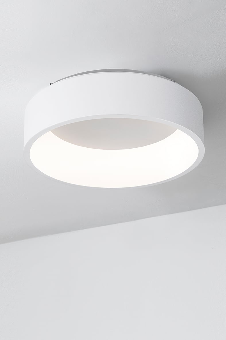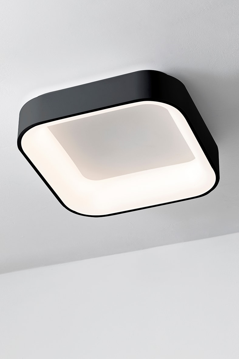 Lampada a soffitto e a sospensione a LED (3000K) in metallo verniciato. Grazie al suo semplice design si adatta perfettamente ad ogni stile e ambiente, intramontabile la forma tonda ed esclusiva la forma quadrata. Il diffusore in metacrilato consente un'ottima diffusione della luce. La versione a soffitto ha una struttura in metallo bianca continua nella parte centrale dando un effetto di estremapulizia del prodotto. E' disponibile in due dimensioni e relative potenze, e in due finiture (bianco e nero).