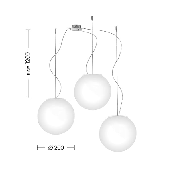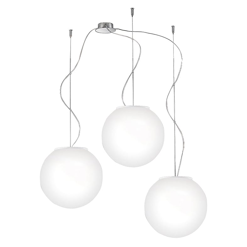 Lampada da soffitto o da parete, a sospensione, da tavolo e da terra con diffusore tondo in vetro so ffiato satinato, per un?ottima propagazione dellaluce. Disponibile in diversi diametri. Nella soluzione sospesa viene proposta in versione singola con rosone bianco, o in caduta multipla a tre elementi con kit di decentramento in finitura cromo. Per la versione da soffitto, a sospensione e tavolodisponibile con LED integrato (2700K) o con attacco E14 e E27 che consentono di montare lampadina LED. La piantana con treppiede in finitura bianca op aco ? proposta nella versione E27.