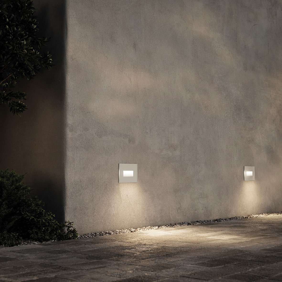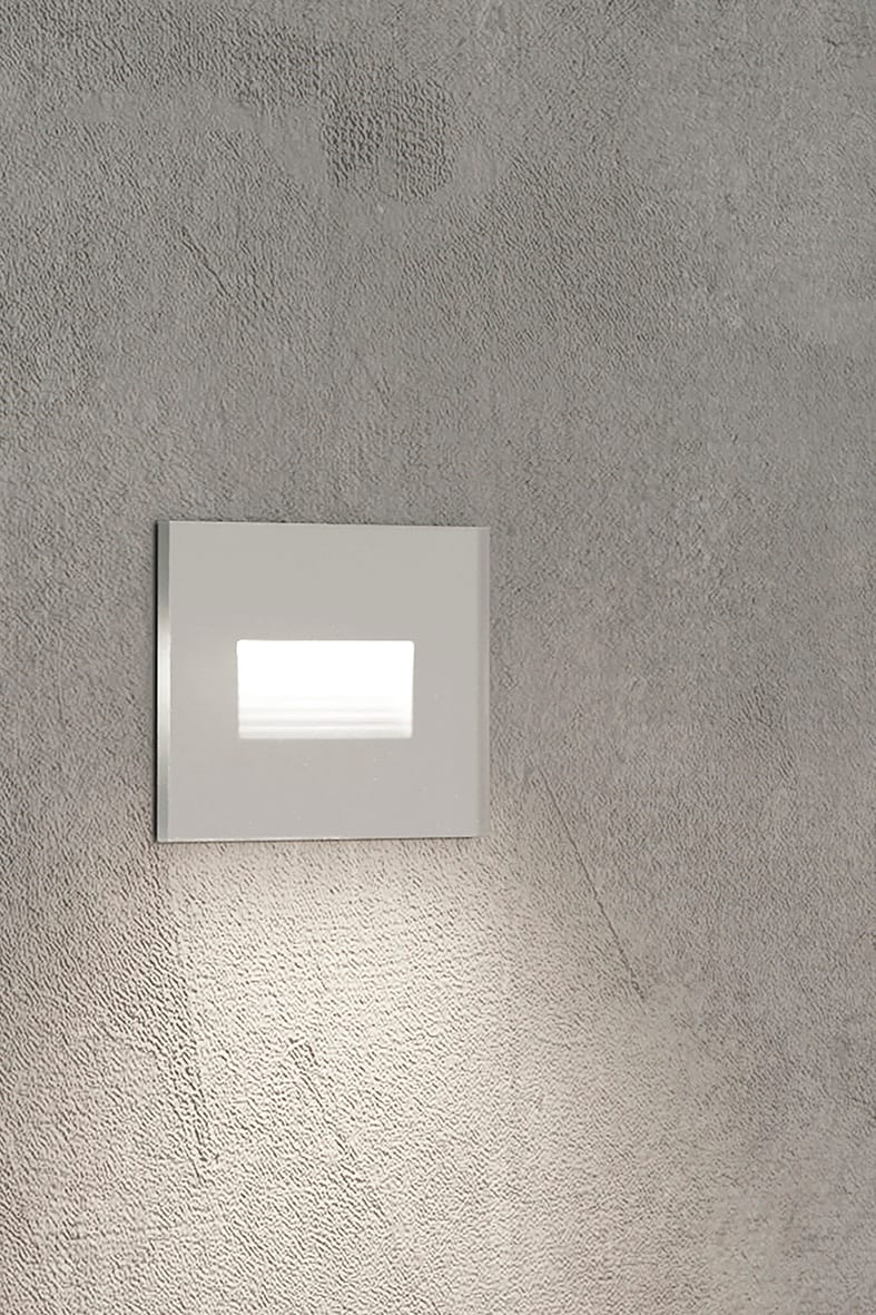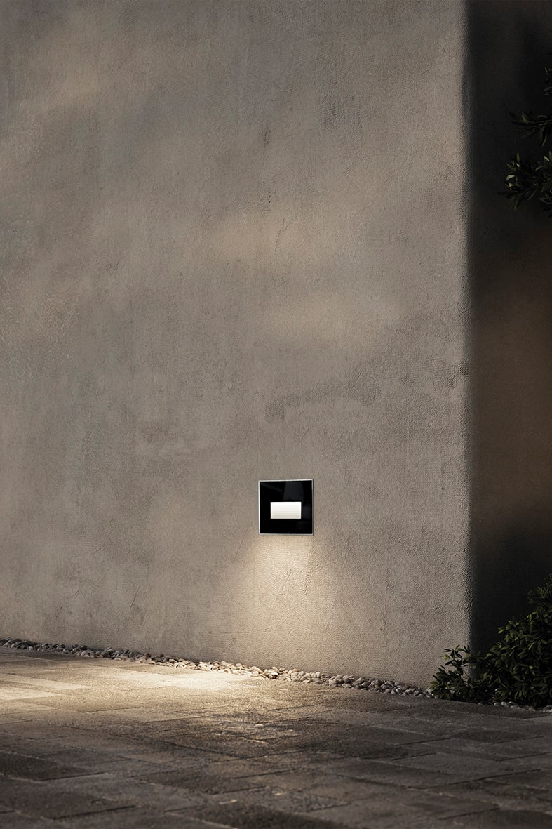 Incasso LED a parete segnapasso per esterno (IP66/20) applicabile in superfici in muratura e cartongesso con scatola 503. Struttura in pressofusione di alluminio verniciata con polveri poliestere a elevata resistenza ai raggi ultravioletti e alla corrosione. Dalla forma squadrata con diffusore in vetro temperato per illuminare e decorare con eleganza ambienti esterni e interni come scale, corridoi, ingressi e zone di passaggio.Alimentatore LED integrato. Disponibile in due finiture (bianco e ner o).