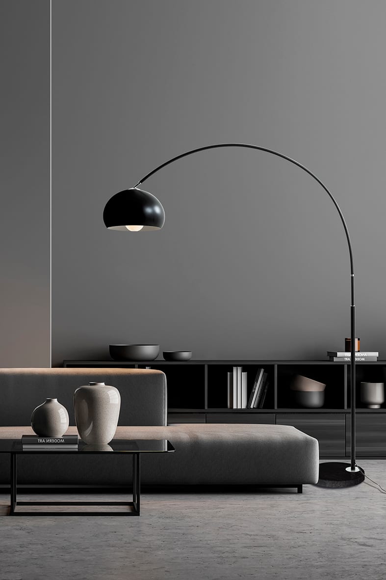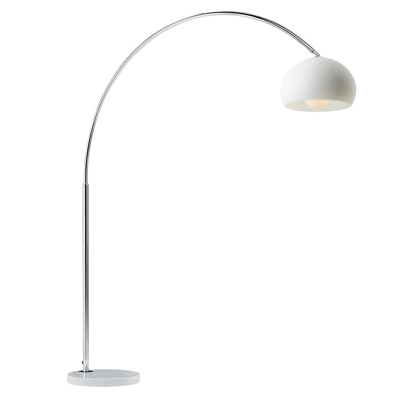 Lampada da terra telescopica ad arco in metallo cr omato, con base in marmo bianco di Carrara o neroMarquinia e diffusore in metacrilato. Proposto nel la versione a luce diretta (attacco E27, finiturabianca, nera o cromo) o a luce diretta e indiretta (attacco R7s, finitura bianco, nero o nickel). Nela versione biemissione il diffusore ? orientabile e ha un vetro satinato, a copertura della fonte luminosa, che permette l?emissione di luce verso il basso.
