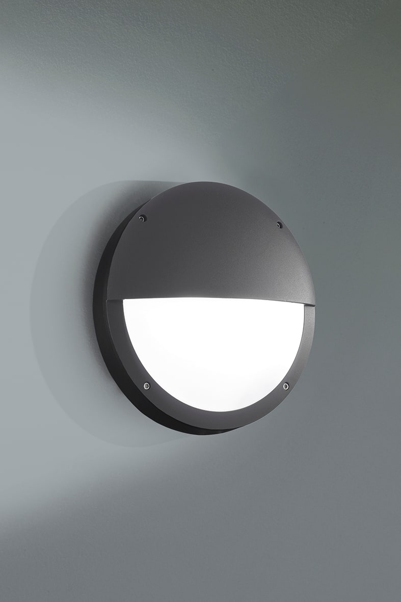 Apparecchio a parete e plafone per esterno (IP54)proposto nella versione a tutta luce e con palpebra, attacco E27 che consente di montare lampadina LED. Struttura in pressofusione di alluminio verniciato con polveri poliestere a elevata resistenza ai raggi ultravioletti e alla corrosione, diffusore in policarbonato. Disponibile in tre finiture (bianco, grigio e antracite). Disponibili giunti certificati IP68 per la realizzazione delle connessioni elettriche, sicure, durevoli e con barriera anti condensa.