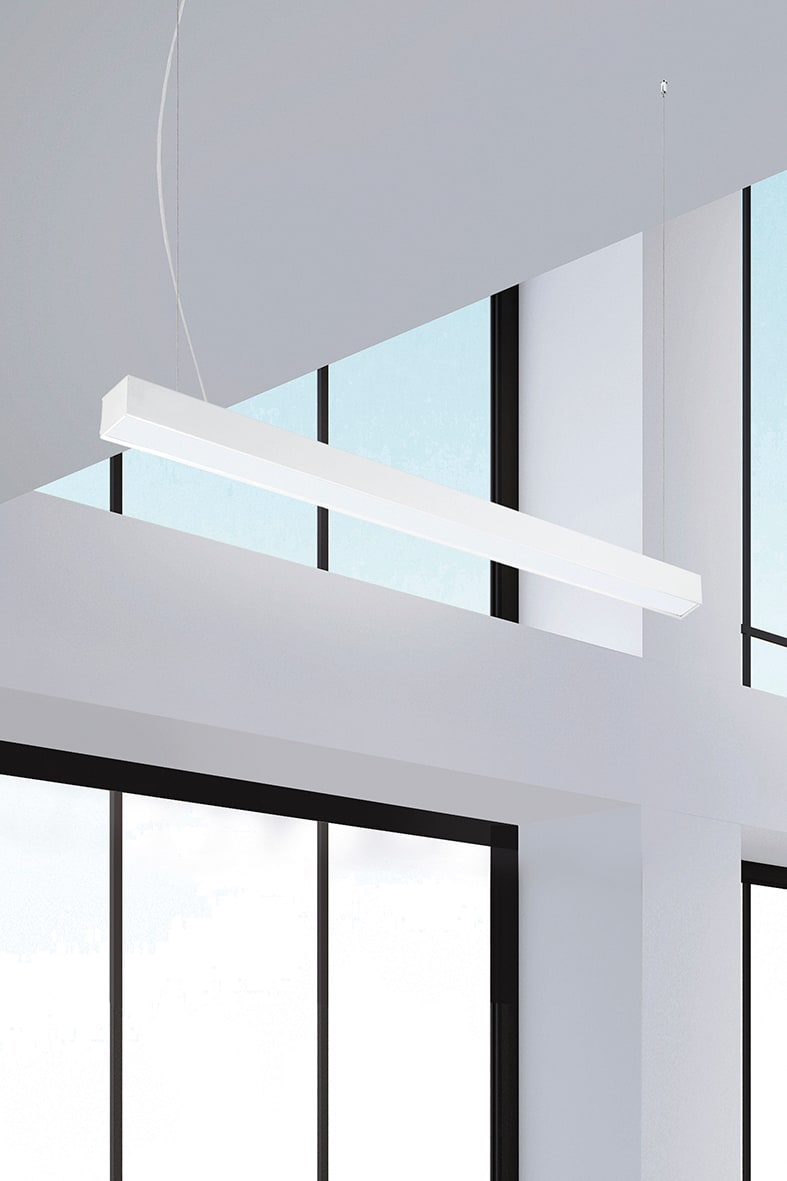 Apparecchio LED a soffitto e a sospensione a luce diretta. Corpo in lamiera di acciaio, verniciatura con polveri epossidiche, resistente agli ambienti umidi e stabilizzata ai raggi UV e schermo diffusore in policarbonato opale, per un effetto di luce diffusa. Disponibile in due lunghezze e relative potenze, due temperature colore (3000K e 4000K) e in due finiture (bianco e grigio). Apparecchio da completare con kit sospensione e schermi da ordin are separatemante.