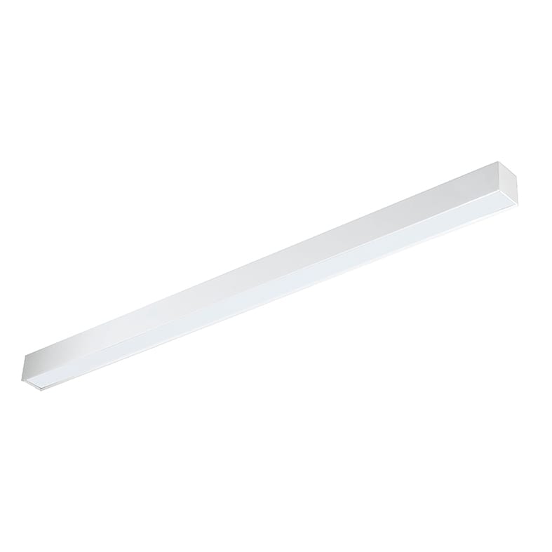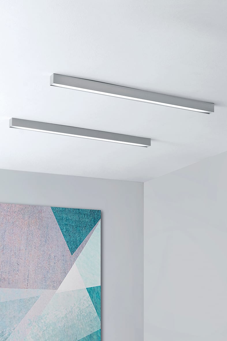Apparecchio LED a soffitto e a sospensione a luce diretta. Corpo in lamiera di acciaio, verniciatura con polveri epossidiche, resistente agli ambienti umidi e stabilizzata ai raggi UV e schermo diffusore in policarbonato opale, per un effetto di luce diffusa. Disponibile in due lunghezze e relative potenze, due temperature colore (3000K e 4000K) e in due finiture (bianco e grigio). Apparecchio da completare con kit sospensione e schermi da ordin are separatemante.