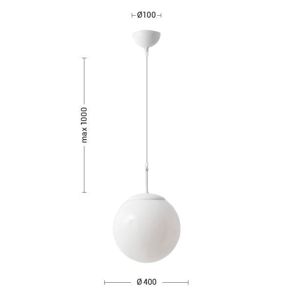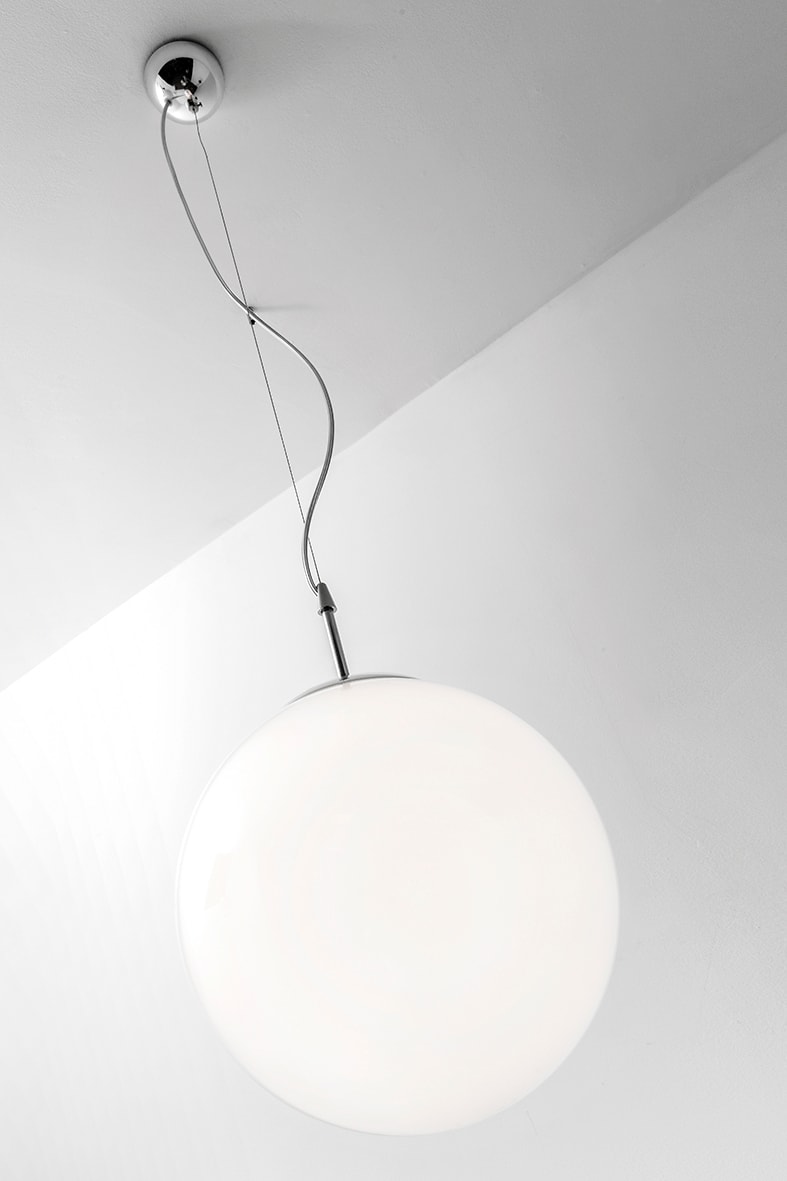 Lampada a sospensione con diffusore a sfera in vetro soffiato lucido. Struttura tige e rosone in metallo laccato disponibile nelle finiture bianco opaco e cromo. Attacco E27 che consente di montare la mpadina LED.