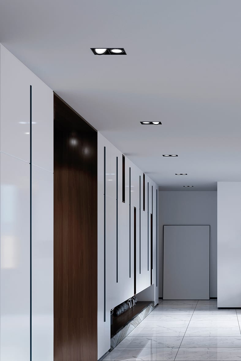 Faretto ad incasso a scomparsa (rasato) da install are in cartongesso, cardanico, orientabile su dueassi di 360? rispetto all'asse verticale e di ?30? rispetto all'asse orizzontale. Struttura in alluminio verniciato. Disponibile nella versione ad uno e due elementi con attacco GU10.